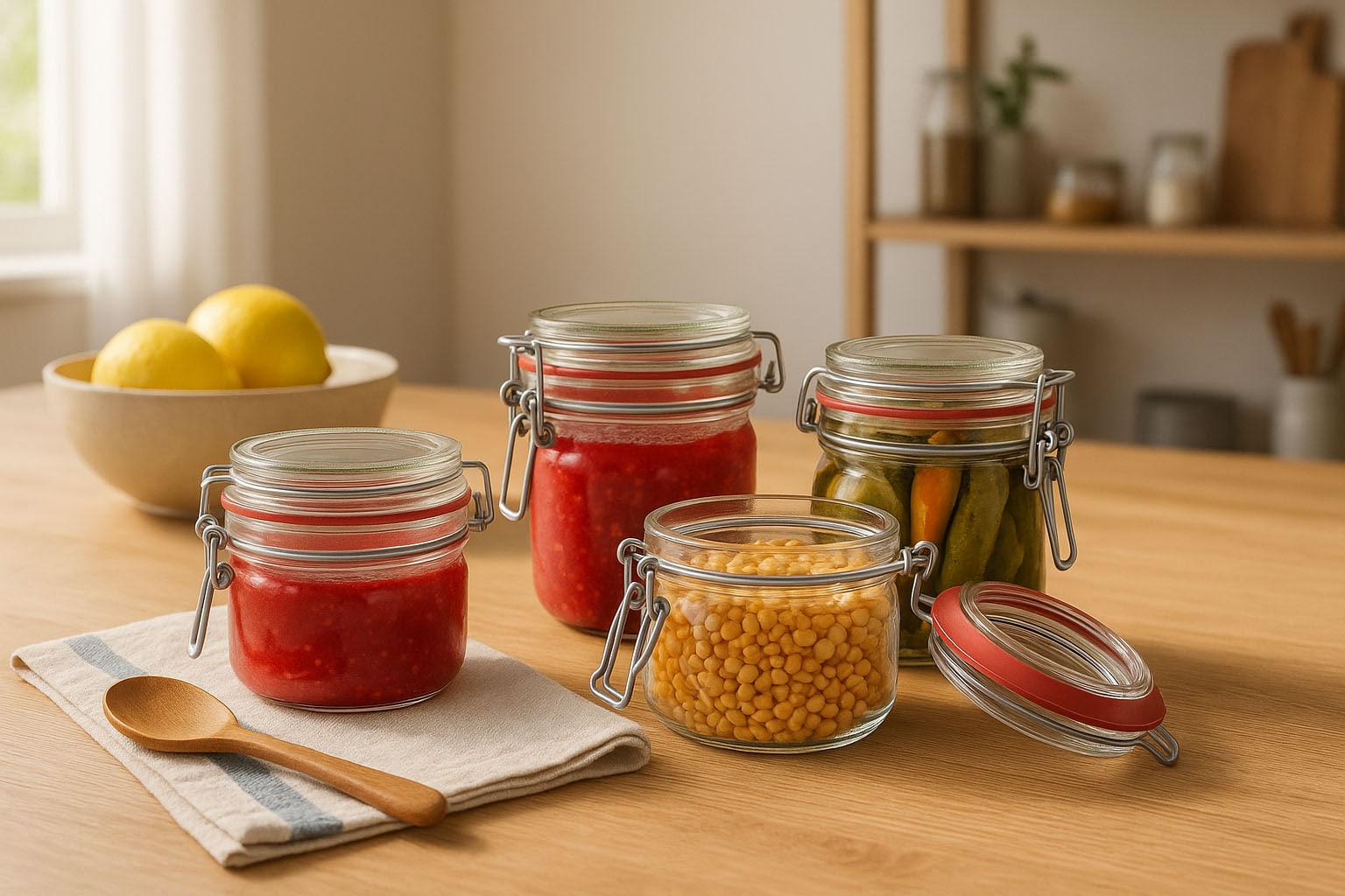 Gotat me kapëse teli janë ideale për konservimin dhe ruajtjen e specialiteteve të bëra në shtëpi si reçelat, chutney-t ose perimet e marinuara. Gjithashtu, ato ofrojnë një zgjidhje higjienike dhe elegante për ruajtjen e ushqimeve të thata si musli, mielli ose bishtajat.